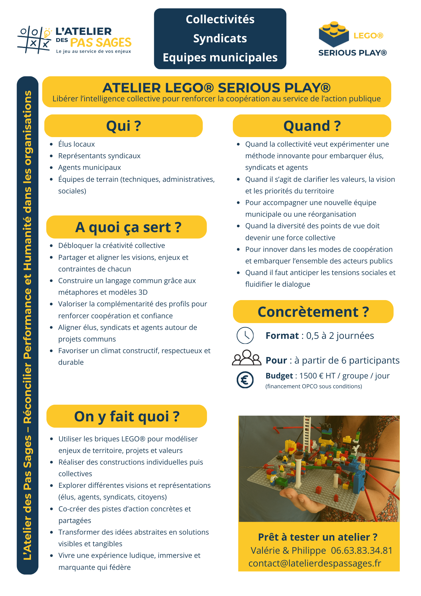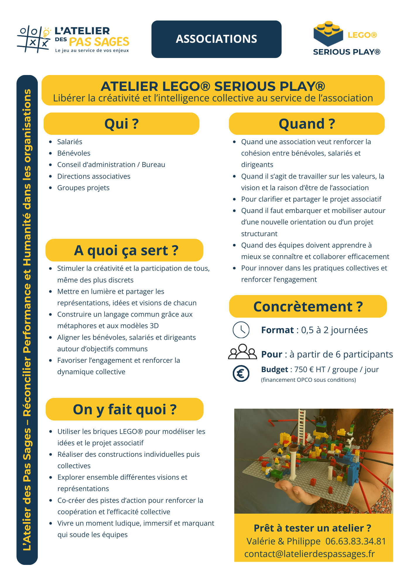 Dans nos organisations, il n’est pas toujours simple de libérer la parole, d’impliquer chacun et de transformer les idées en actions concrètes. L’atelier LEGO® SERIOUS PLAY® crée un cadre structuré et ludique pour explorer ensemble des enjeux complexes, partager des visions et construire des solutions tangibles.